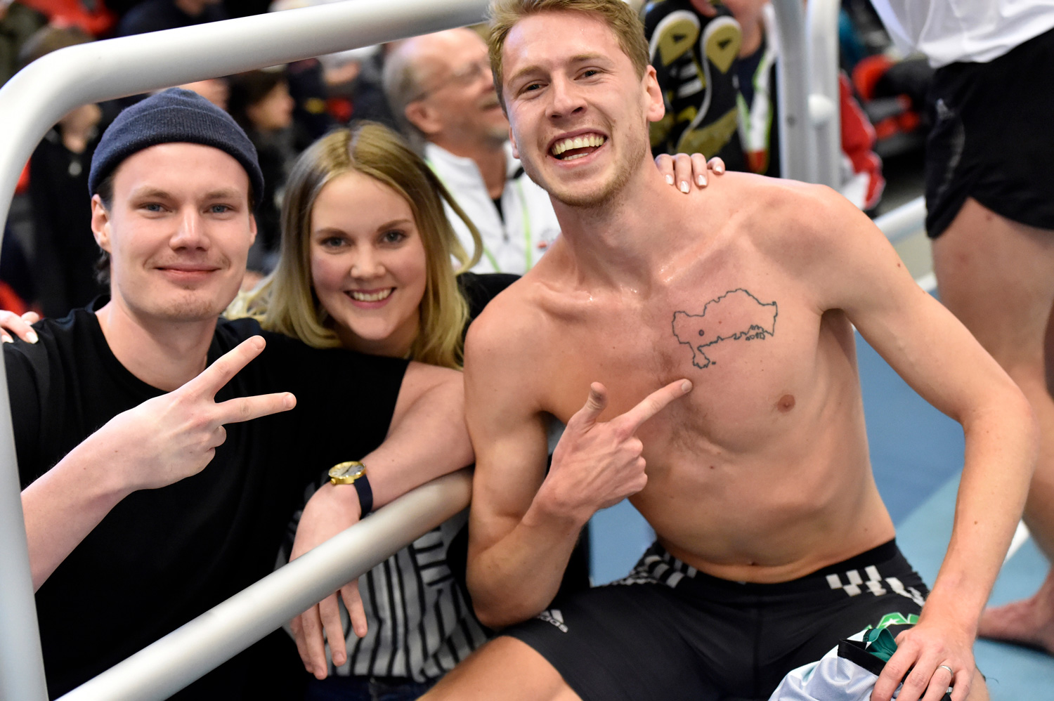 När Jonas vann SM-guld 2017. Bilden togs efter målgången tillsammans med frun Frida Glans och barndomsvännen Viktor Berg. På tatueringen finns Svängsta utmärkt på en Blekingekarta. Jonas tar ofta av sig tröjan efter ett lopp så man ska kunna se den. (Foto: Deca Bild & Text)